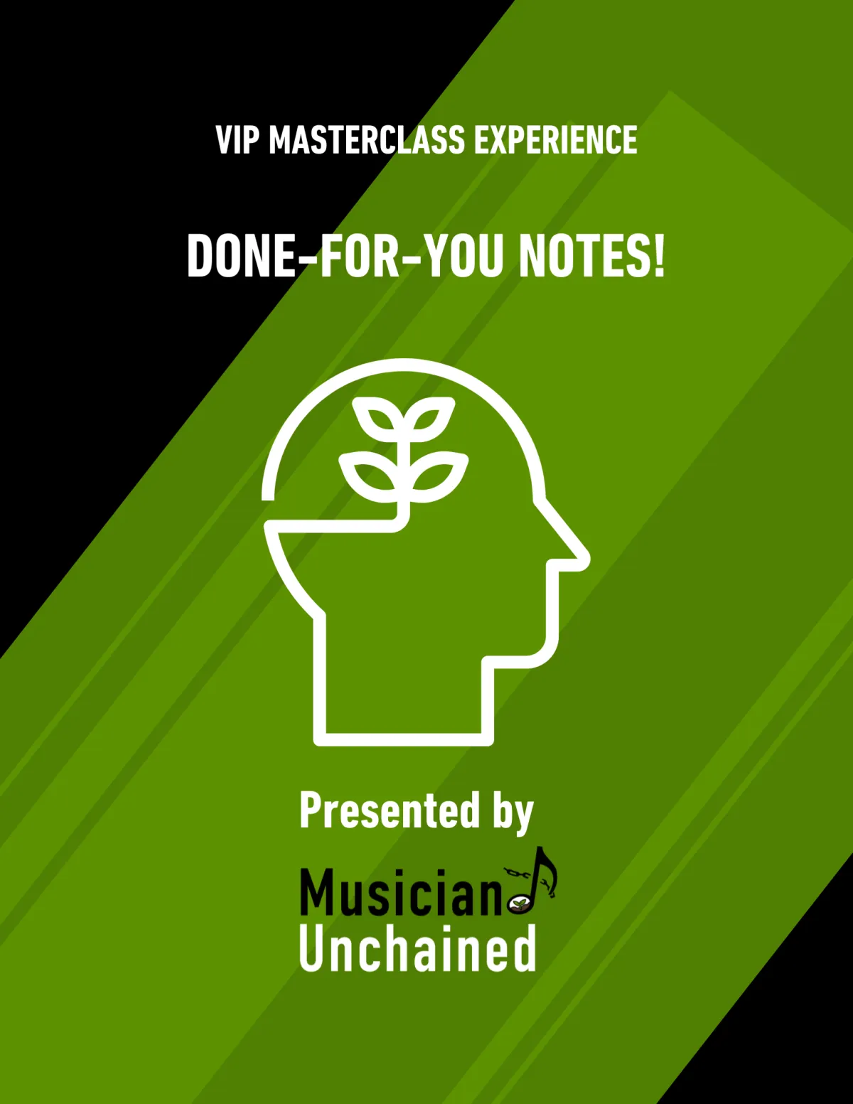 This is the most immersive, most in-depth and most connected way to experience this session now and in the future. You'll get Done-For-You Notes, lifetime access to the masterclass, group coaching, AND MORE! All for less than it costs to take two people to Chik-fil-A! Those who want to truly thrive are joining the Musician Unchained VIP Experience... will you be there with us?